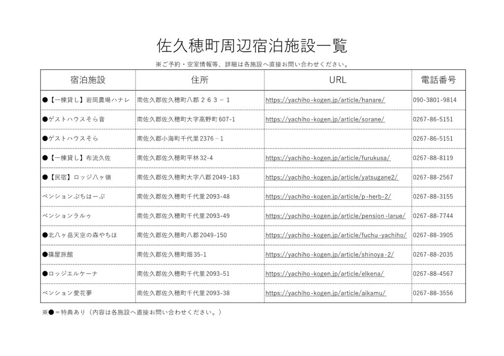 大会当日もしくは前日にご利用いただける佐久穂町周辺の宿泊施設は以下をご確認ください。 ツール・ド・八ヶ岳に出場される方には特典がつく宿泊施設もございます✨特典内容に関しましては各施設へお問い合わせください。